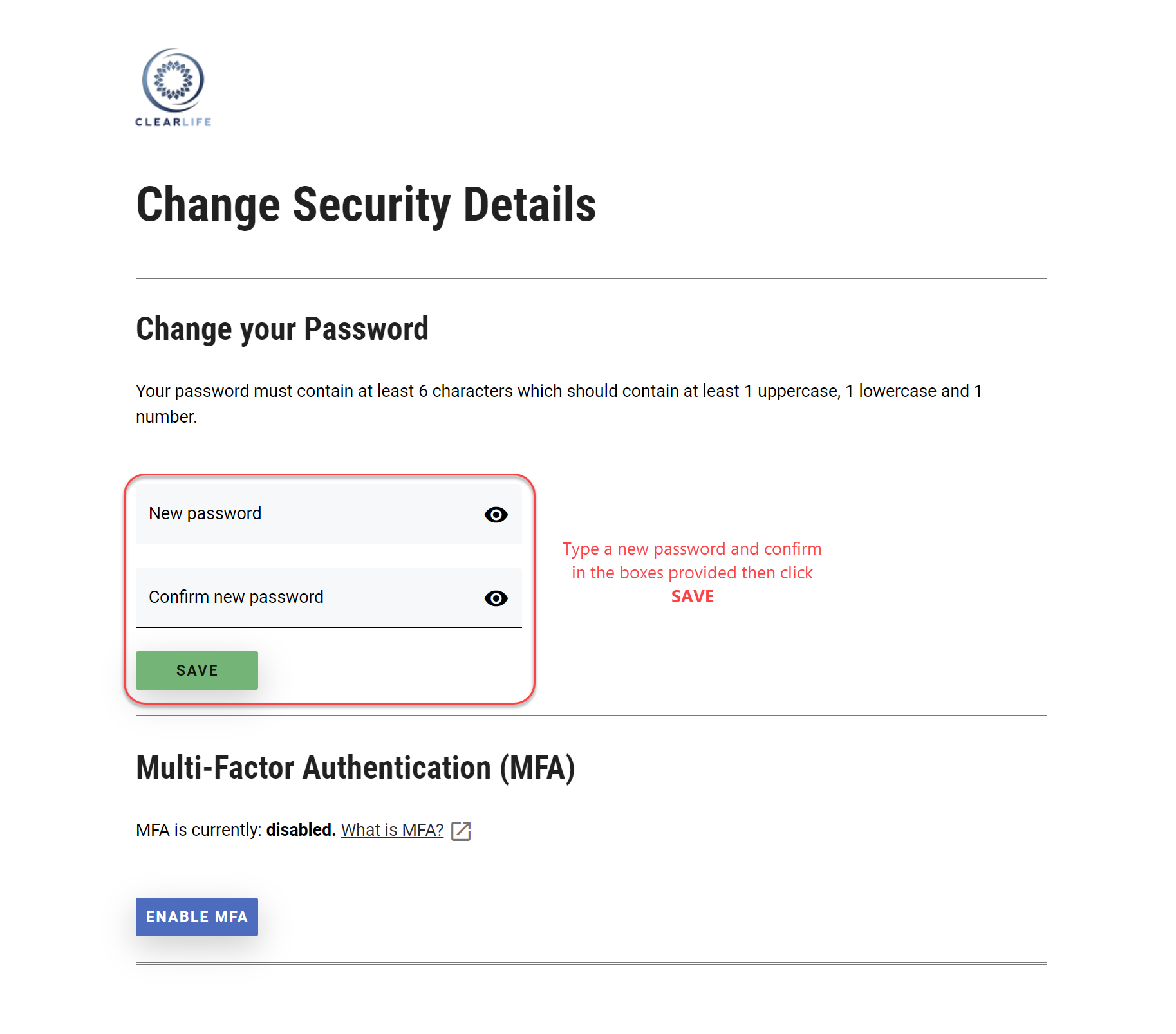 Assuming company-wide MFA has not been enabled, a user can switch on/off MFA for their own account using the ENABLE/DISABLE MFA button.