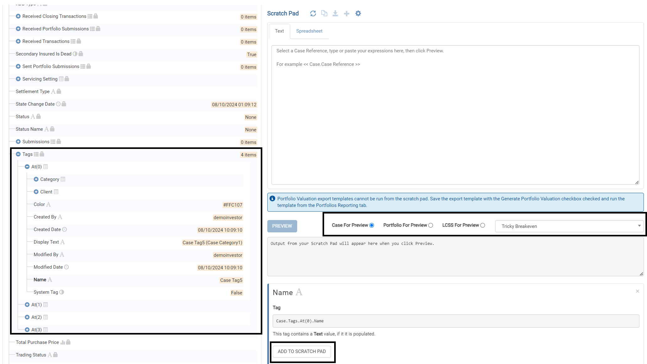 For Export Template report creation, you can simply add all the required tags to the scratchpad and create a new template out of it. This template can be run against a case or portfolio on an Advanced search page or on the portfolios page.