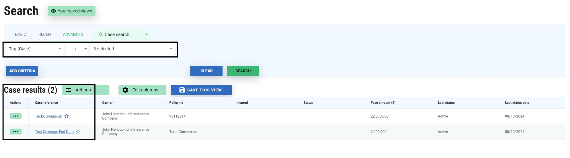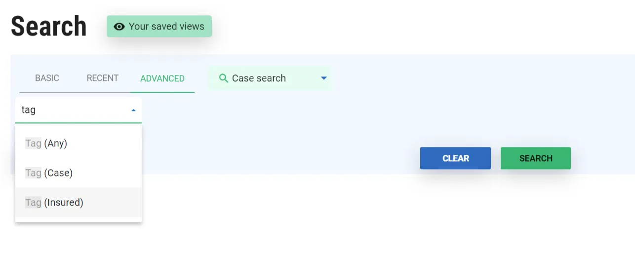 ClariNetLS allows you to search for cases by tag names attached to the case page or Insured page.