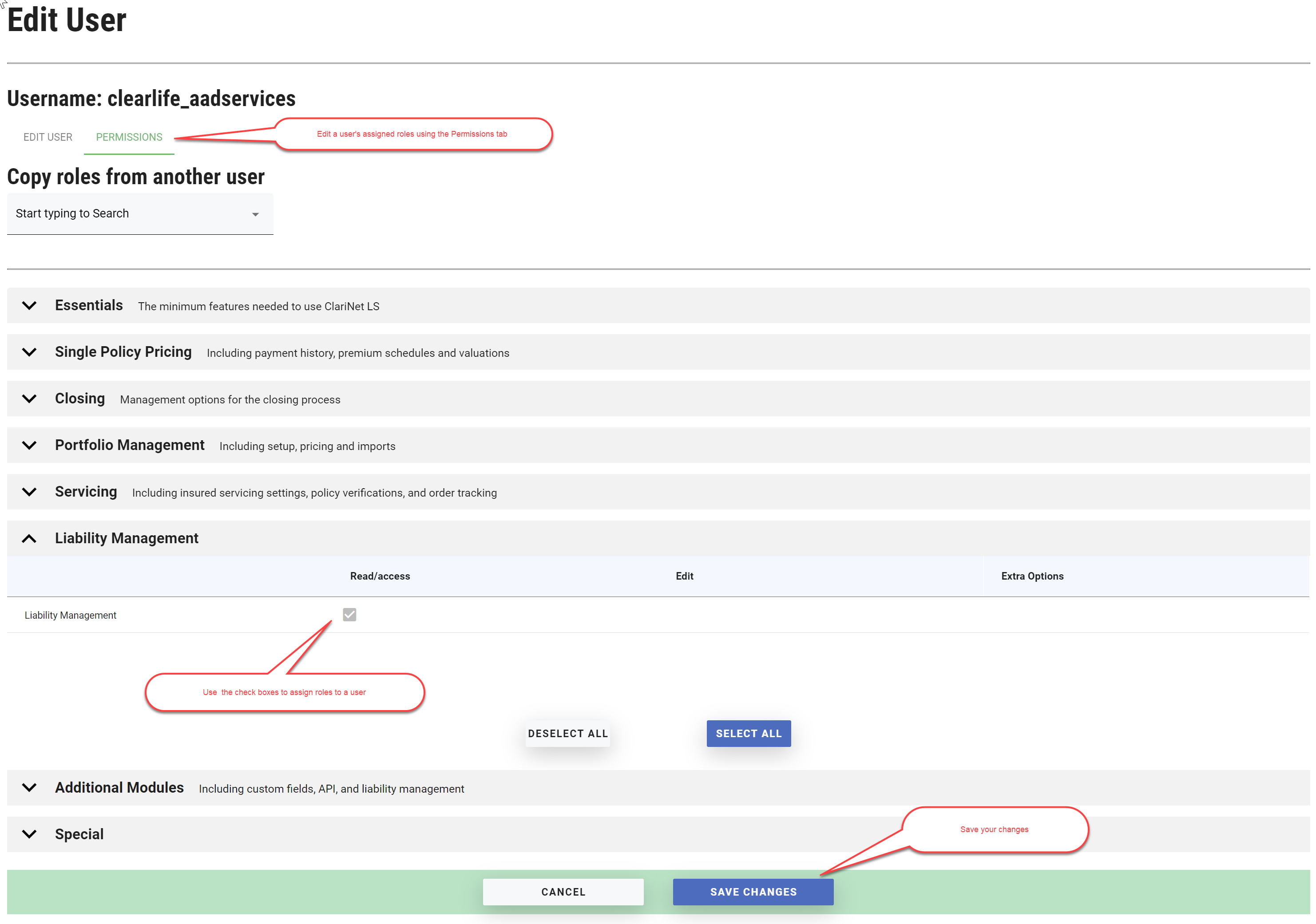 To add or edit users and assign roles you must have Client Administrator permission in ClariNet LS.