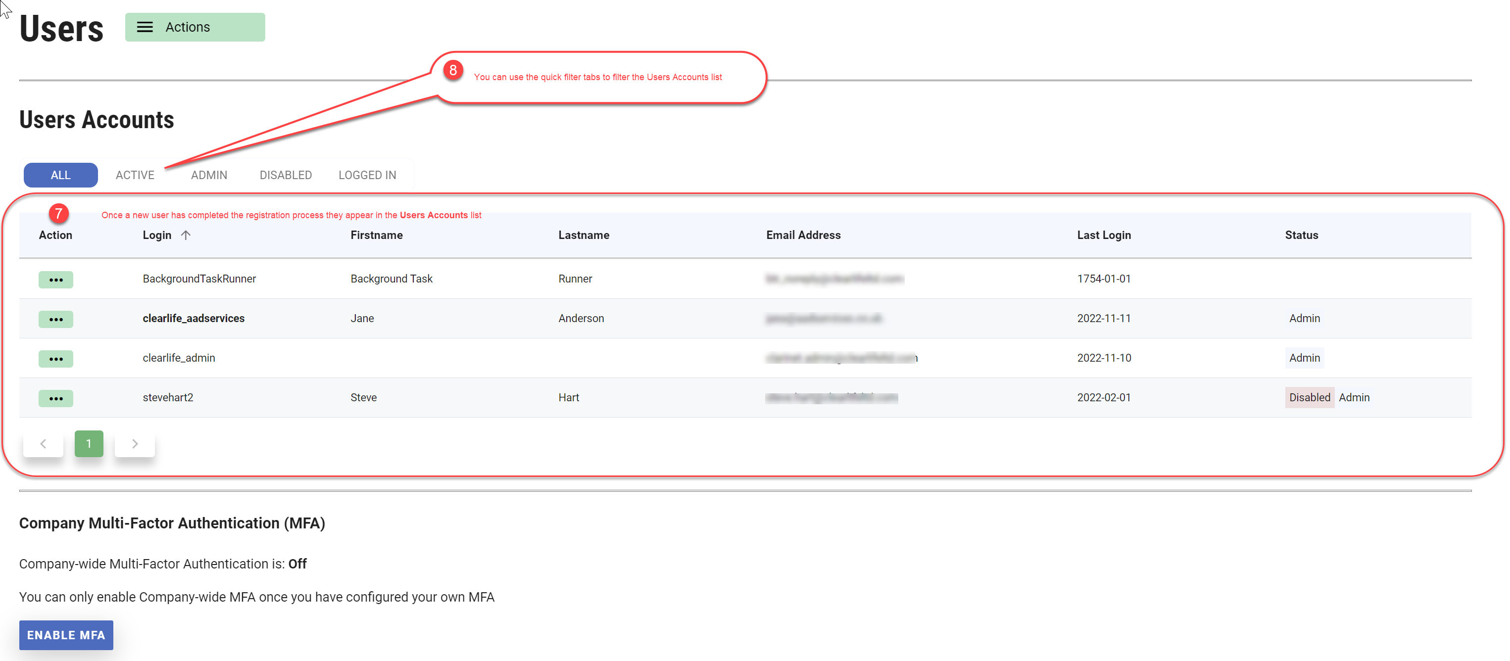 You can use quick filter tabs under Users Accounts section to filter your list view.