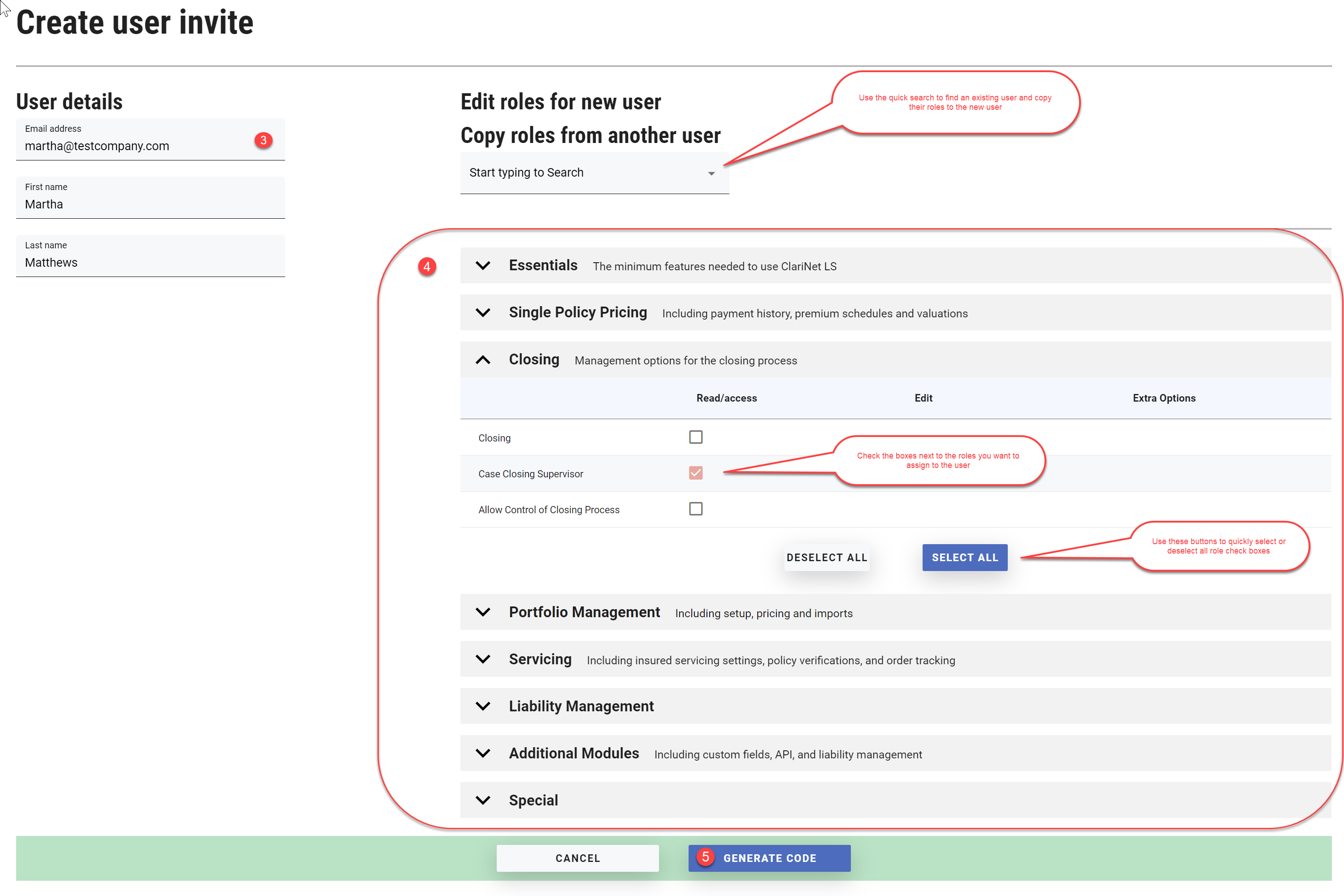 - Once you have selected the required roles, click the GENERATE CODE button at the bottom of the page. A six digit code will be generated which you need to note down. The user you are inviting will need this six-digit number in order to complete their account creation process.