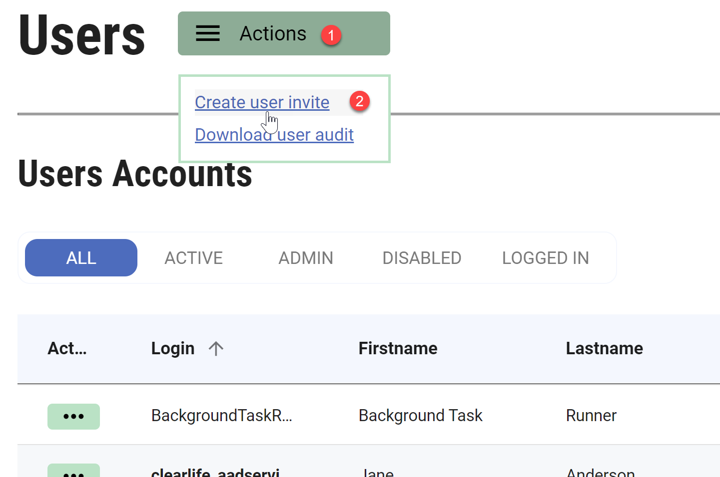 Click on the Actions Button next to the Users section followed by Create User Invite.