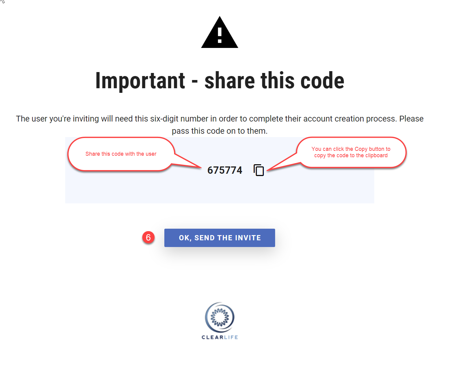 Click on OK, Send THE INVITE button. This triggers an email invitation to the new user from the ClariNet LS administrator, which includes a link to complete the registration process online.
