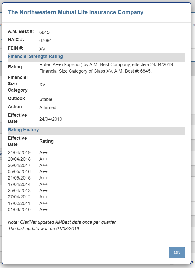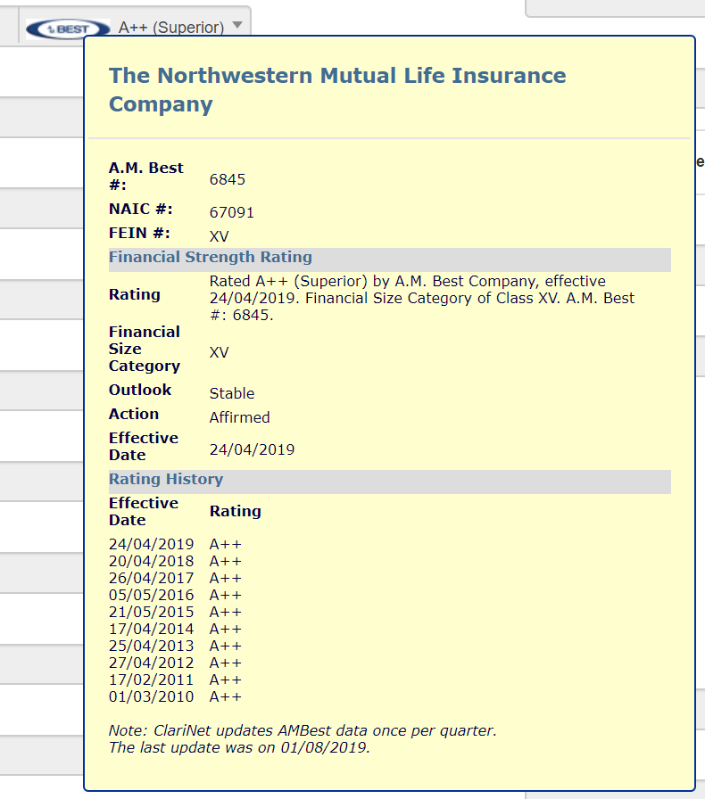 ClariNet LS updates AMBest data once per quarter. The last update was on 01/08/2019.