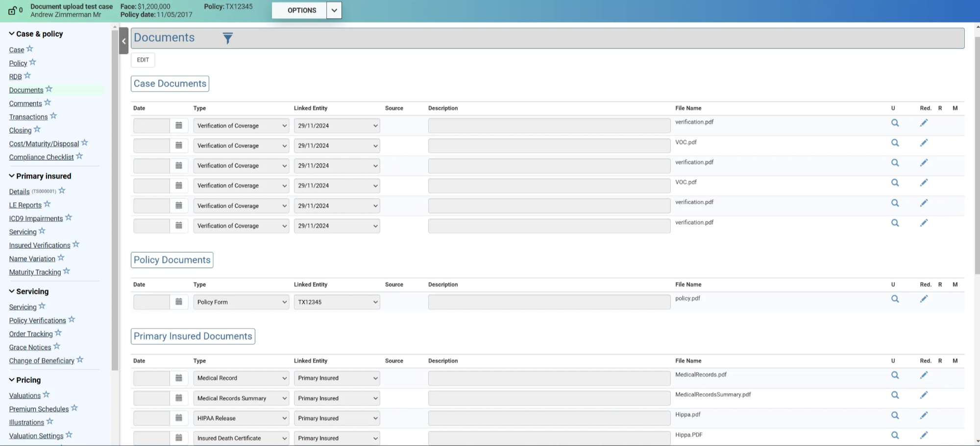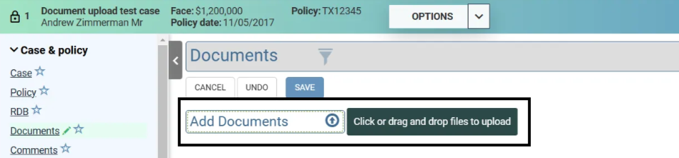 The Type dropdown menu allows you to assign a document type. The document types available in the dropdown are dependent on the category of document, i.e. whether Case, Policy, Illustration, Primary or Secondary Insured or Closing. Additionally, a document can be Uncategorized.