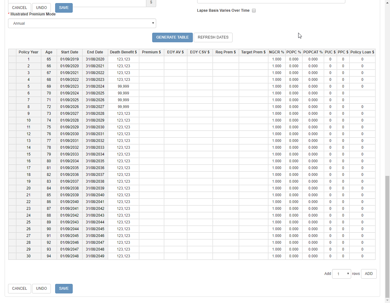 You can add a new row by right clicking on the row selector (the grey square at the beginning of each row) and then selecting "Insert a new row before" or "Insert a new row after", which will add a new row either before or after the selected row. In the case of the Illustration page, this new row will be given a Policy Year, Age, Start Date and End Date automatically.