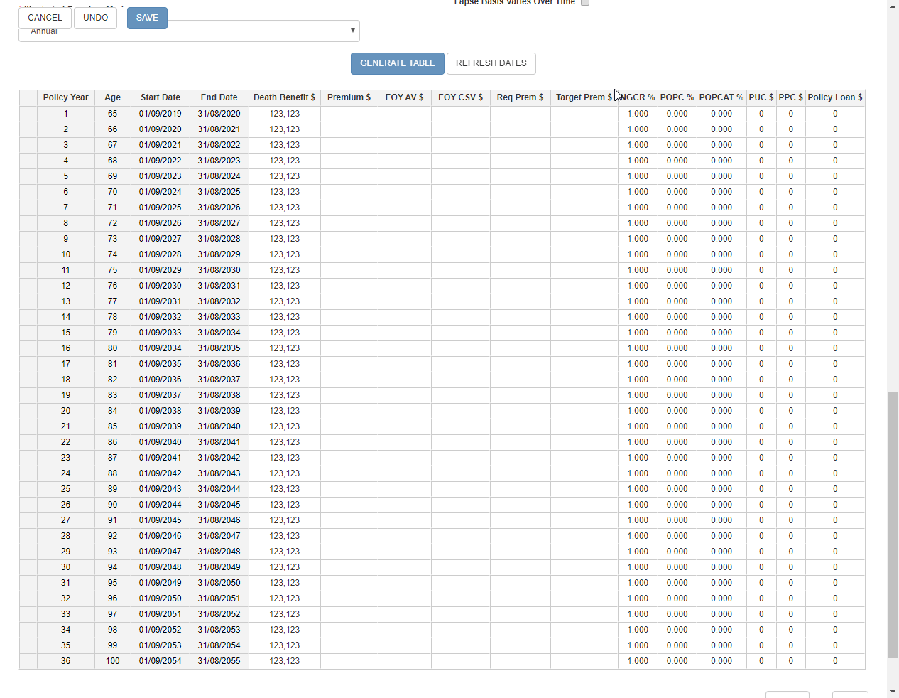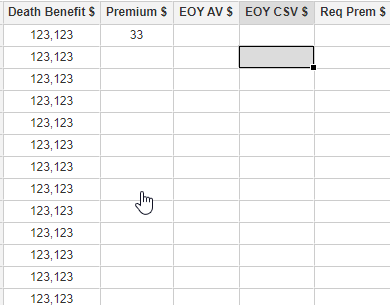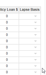 In the edit mode, editable cells have a white background, as in Excel. The headers and row selectors (the empty grey square at the beginning of each row) cannot be edited. Further, some tables may contain cells that cannot be edited because they are calculated, such as Policy Year or Insured Age in an Illustration table. Note that even if these cells are read-only, they can still be part of a selection and copied to the clipboard. However, pasting will have no effect on them.