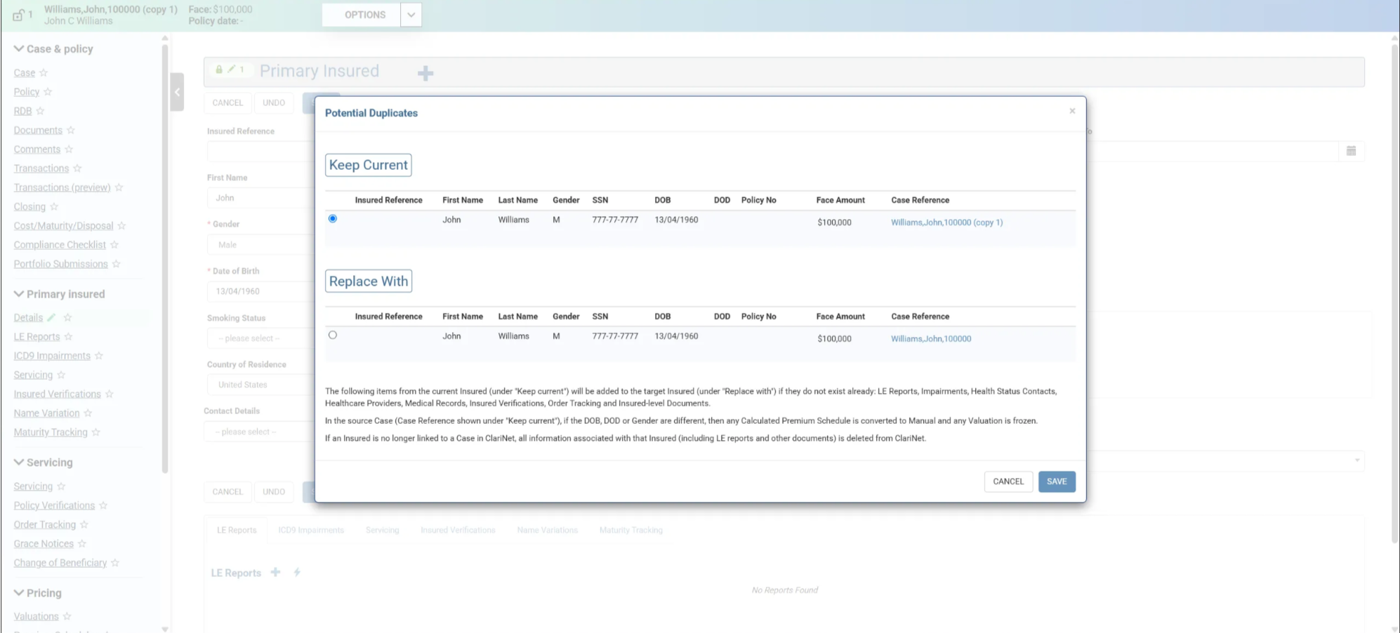 Once an Insured has been consolidated across multiple Cases, any changes made to that Insured in one Case will automatically appear in the other Case (there is only one Insured, all Cases point to it). This applies to all Insured information and all objects linked to that Insured, including LE reports, Insured Verifications, Health Status Tracking, Health Status Contacts, Healthcare Providers, ICD-9 Codes and Medical Records/HIPAA Releases.