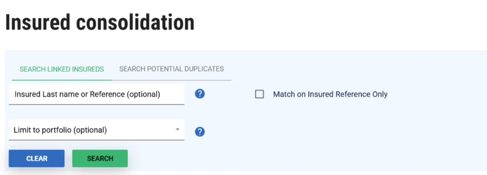 Start by clicking on the Menu Button in the top bar, then select Insured Consolidation link under the Insureds menu. This opens the landing page shown below. The same page is also shown at the end of an import (Excel or XML), but in this instance only Cases that have just been imported are checked for duplicates.
