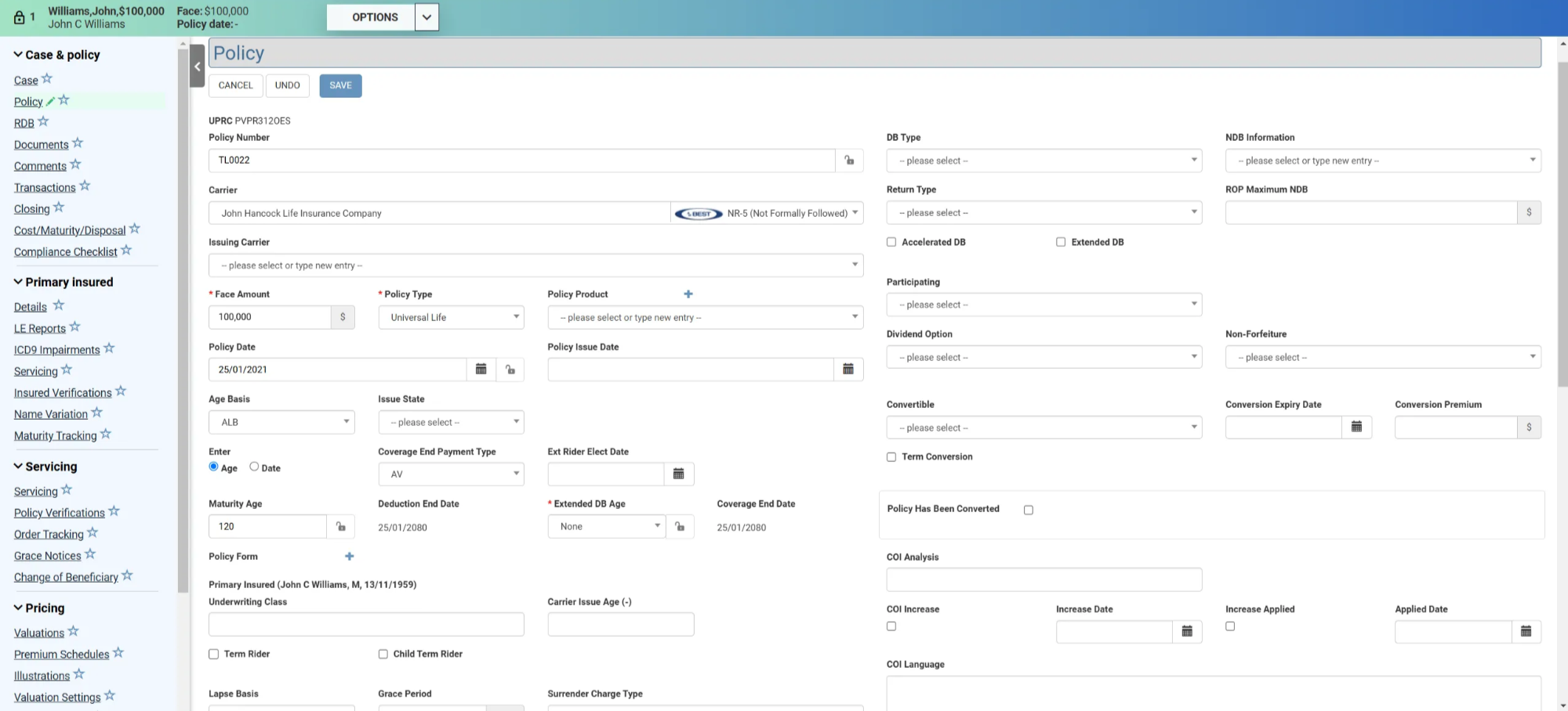 | Face Amount | The base amount of Death Benefit for the Policy. You should review the Policy Form and Schedule and any Illustrations carefully to ensure that this value is correct. | Yes | Numeric less than 150 |