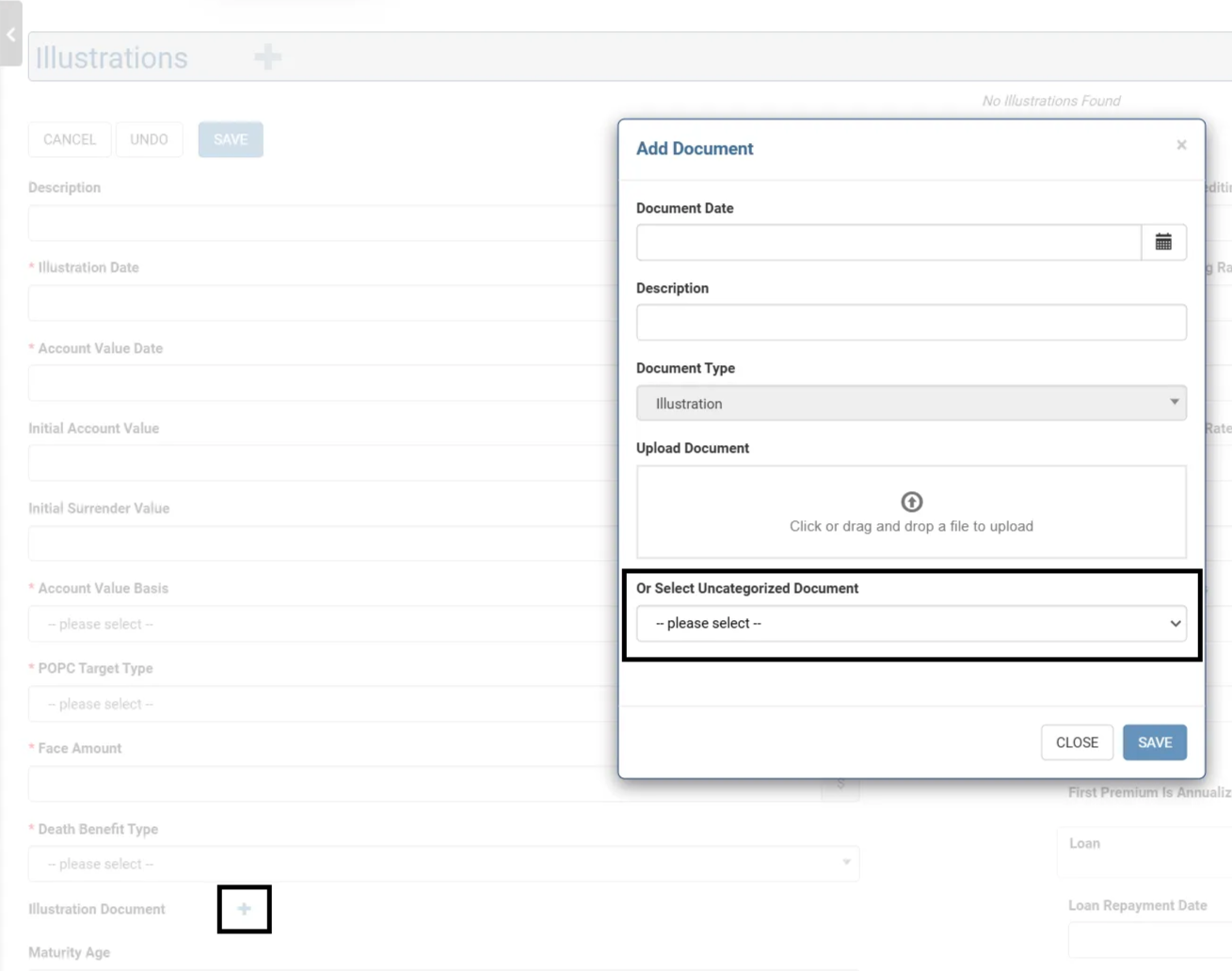 - Some Document types such as "Illustration" or "VOC" require that the relevant full object (an Illustration or a VOC) be created in ClariNet LS first. Once created, you can then assign the document to it. It is NOT possible to set a document type to Illustration and not have the Illustration entered first. See the "-- please select --"" dropdown on this screenshot, which would result in an error as this Case has no existing Illustrations to assign this document to. Once you click SAVE on the Documents page, these assigned Documents will move to the relevant section of the page: