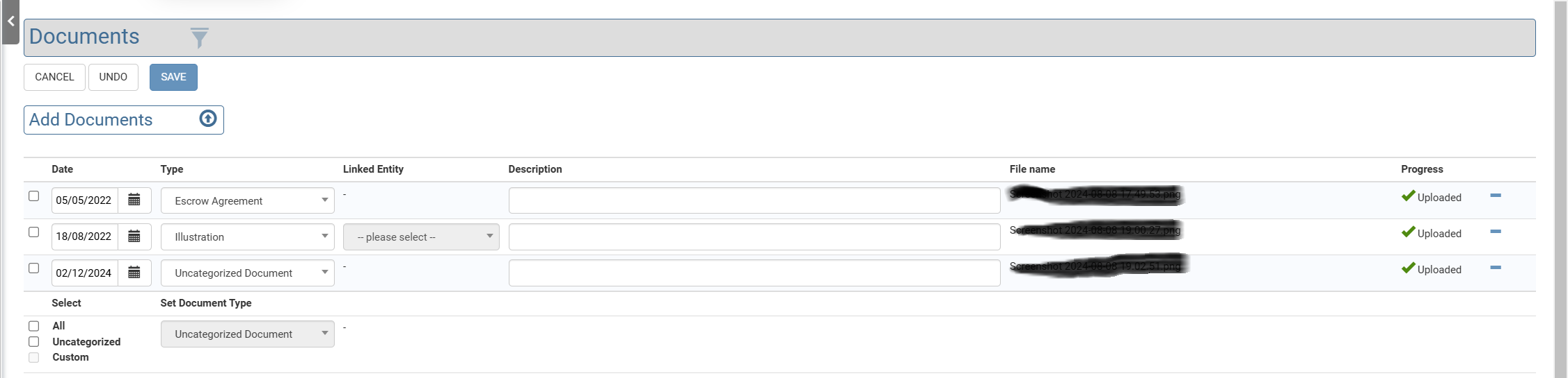 All the files are added in the Uncategorized Documents section, on the Case, Documents page. It would be very difficult to guess accurately which category to add documents in.