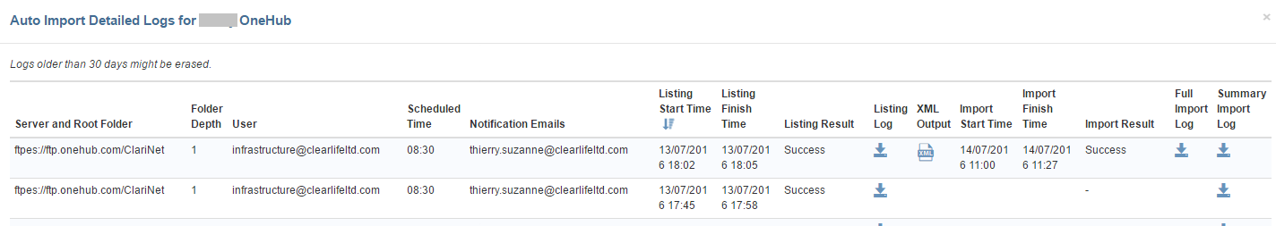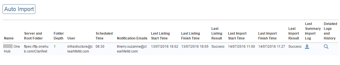 You can have multiple Auto Import tasks, each line in the summary table shows the last status under Last Import Result, start and finish times, as well as a download link for the Last Summary Import Log: