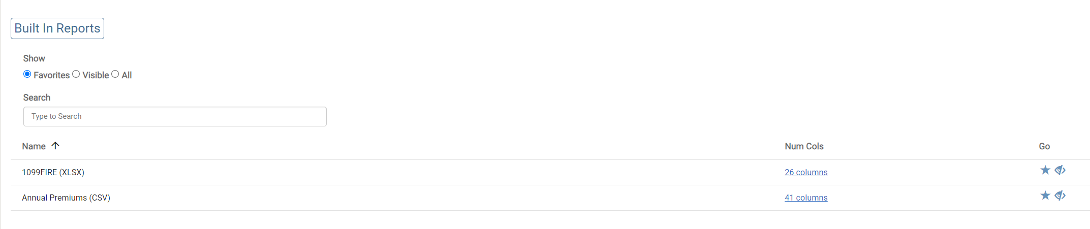 Example: The 1099Fire(XLSX) and Annual Premiums (CSV) reports are hidden as shown in the screenshot below. These reports are now hidden. Hence the fully open eye represents that the report is now hidden and you can click on the same to make it visible.