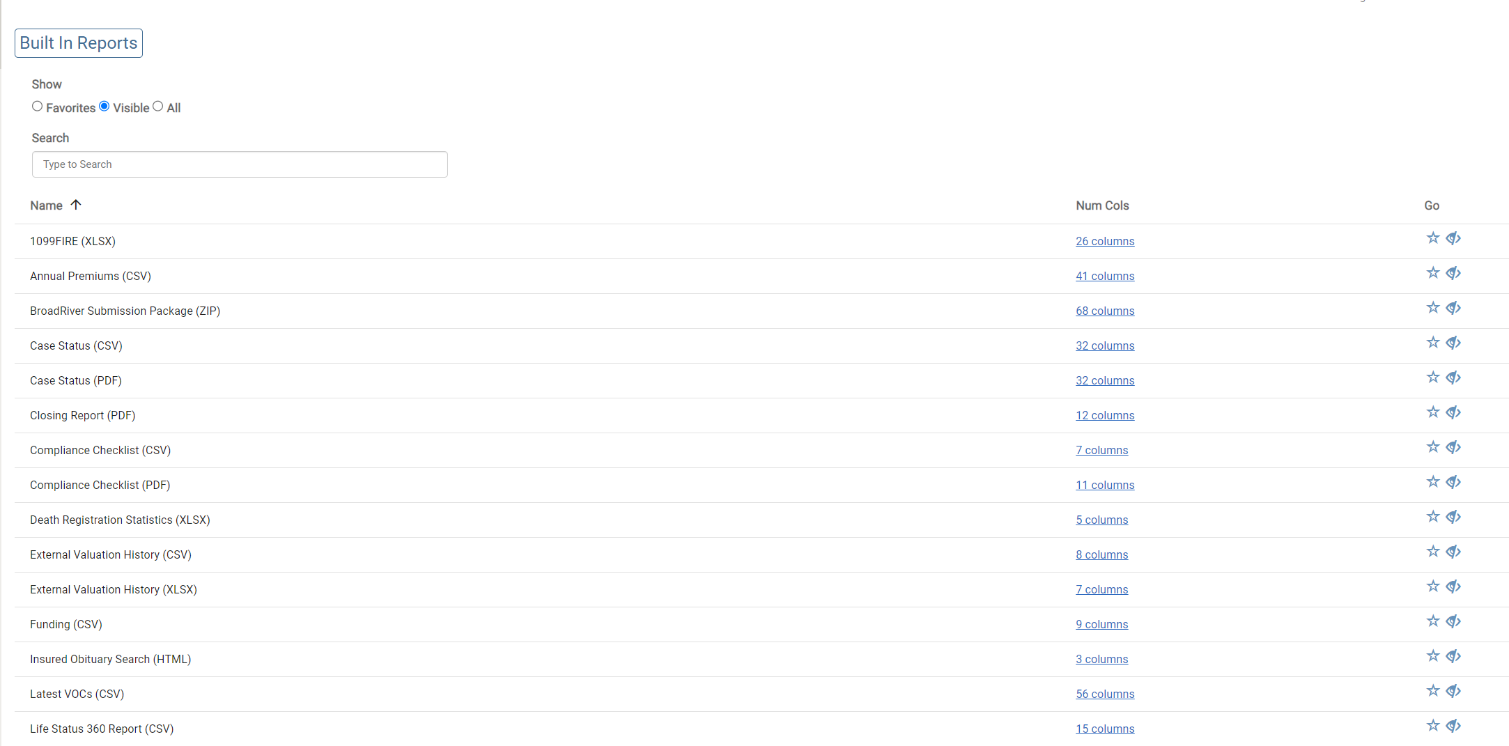 | Case Status (CSV & PDF) | Information about the case: Case Reference , Status (Active/ Not Active), Broker, Carrier, Seller, Policy Type, Policy Number, State, Face Amount, Issue Date, SSN, LE50 (21st/AVs/EMSI/Fasano/ISC/LSI/Predictive/Elevation/Lapetus/Polaris/User Define) | N/A |