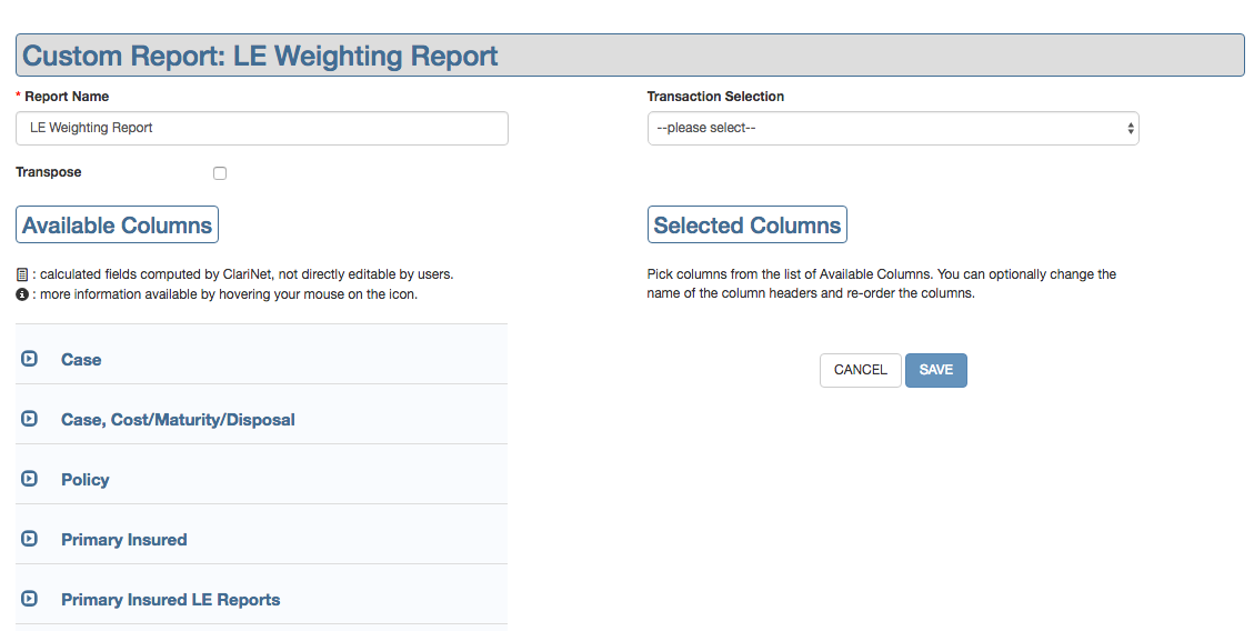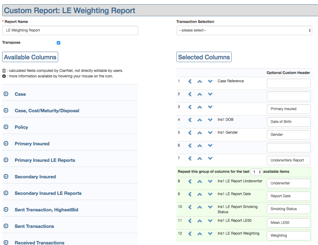 - Transpose: The default layout is for each unique Case/Transaction to run from left to right across the page. Checking this box changes the layout to run top to bottom. This is particularly useful when building a Custom Report to work with the Portfolio Uploader.