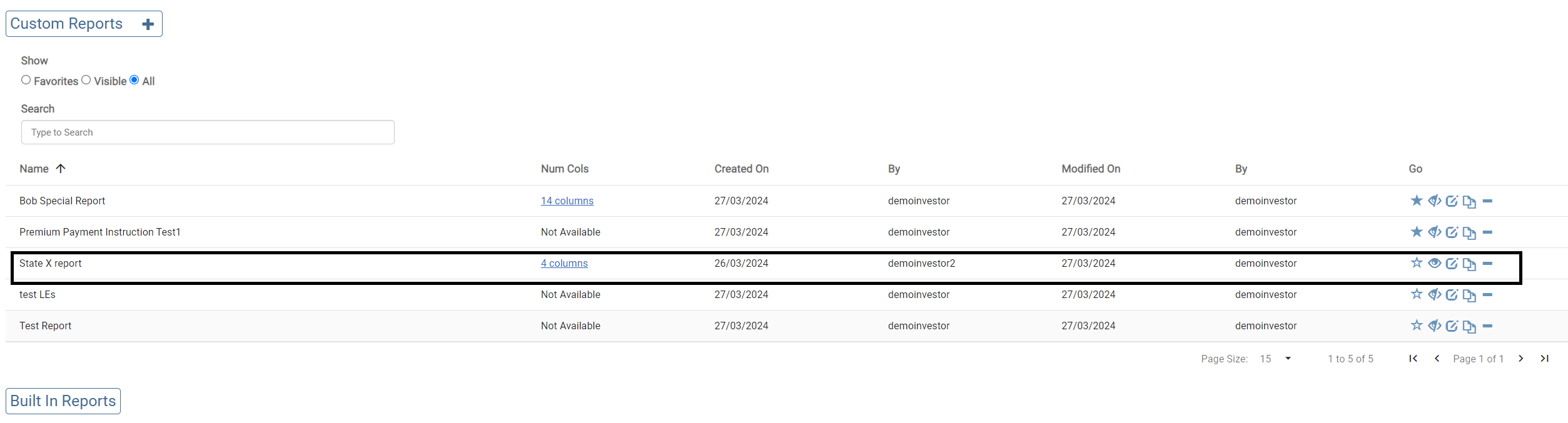 Adding or editing the contents of a Custom Report is done by clicking the Edit icon under the Go column, which opens the Custom Report page.