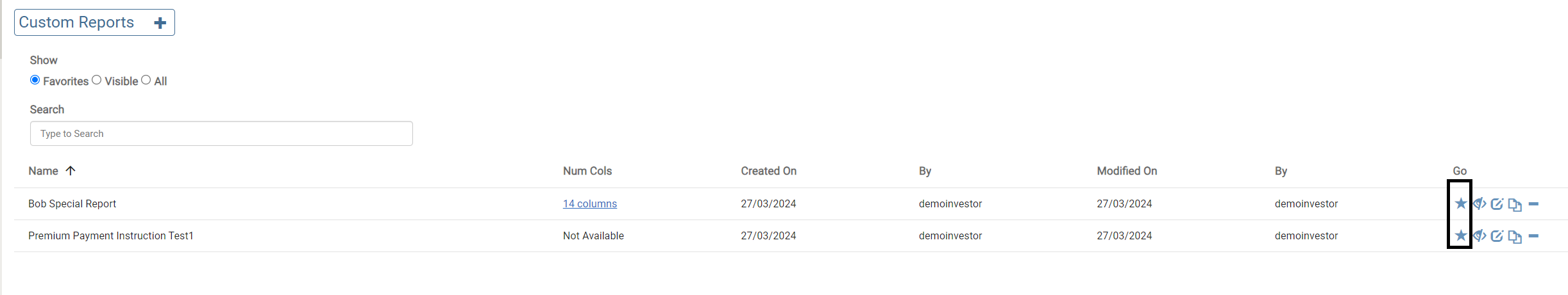 The empty Star icon under the go column allows you to favourite a report by clicking on the icon.