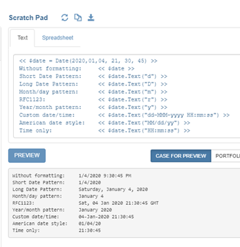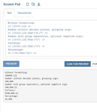 The values the Tags provide correspond to the raw values stored for the field. For example, dates include timestamps even if they are only used to represent date values and the time portion is not relevant. You may not want these in your output. When outputting to Excel, this generally is not a problem as you can use normal Excel formatting options to control the format of numeric and date values. However, if you're outputting to a text target, or you are combining several different fields together in the same cell, you may need to specify the format for a tag. In that instance, you can use the .Text() function to do that. The text function accepts a string as the only argument which specifies the format to convert the value to.