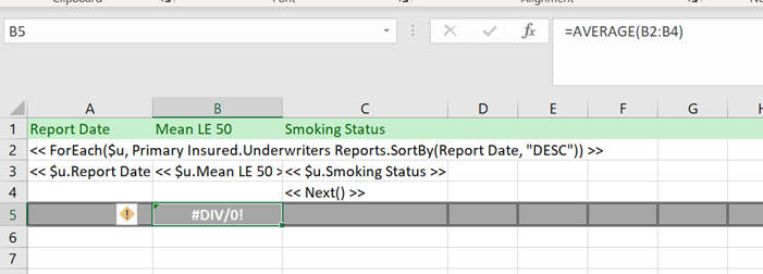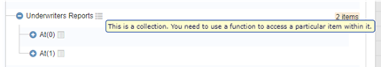 In the Case we have selected in the Tag Explorer, it is telling us this is a collection containing 2 items. If we try a template that outputs that tag directly, in the output we will see the following error: #ClariNet: The expression ”<< Primary Insured.Underwriters Reports >>” resulted in a value that cannot be output. That is because we need to be more specific about what we want from this collection. For example, let's say we want to output the Mean LE 50 of the first report in the collection. We would use the .First() function to do that: << Primary Insured.Underwriters Reports.First().Mean LE 50 >> .