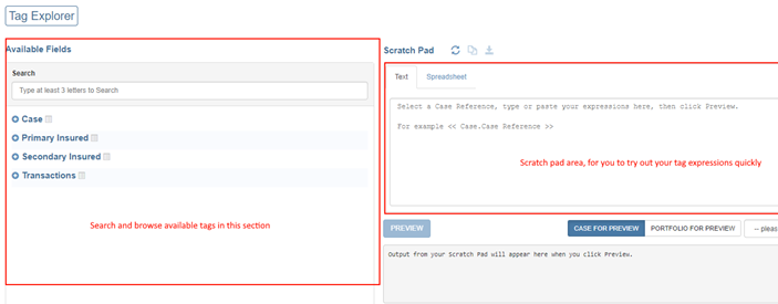 The main areas of the Tag Explorer are shown below. The left-hand side presents the data model in a logical tree structure that is available to use within Templates. At the top level, there are high level entities such as the Case, the Insureds and the Transactions on a Case. You can then drill down into lower level properties of each, such as the Insured's name, the Case Face amount, transaction bid information, and so on. If you select a Case (underneath the Scratch pad on the right hand side, which will start empty and show -- please select --), then the tree will show the values corresponding to that Case next to each Tag.