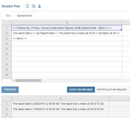 << ForEach($u, Primary Insured.Underwriters Reports.SortBy(Report Date, "DESC")) >>