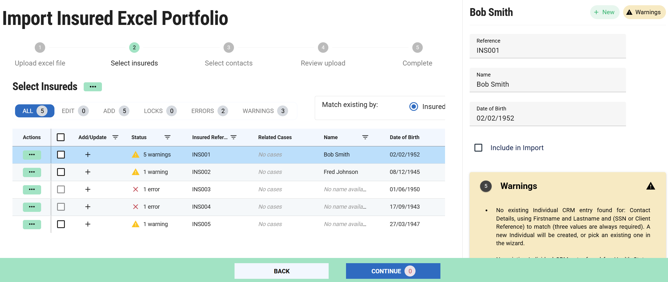 Once you have uploaded a sufficiently valid excel template, you will move to the second step of the import, which will present a list of the Insureds that were found in the Excel file as below. Clicking on a row will expand a slide out from the right hand side which provides additional details.