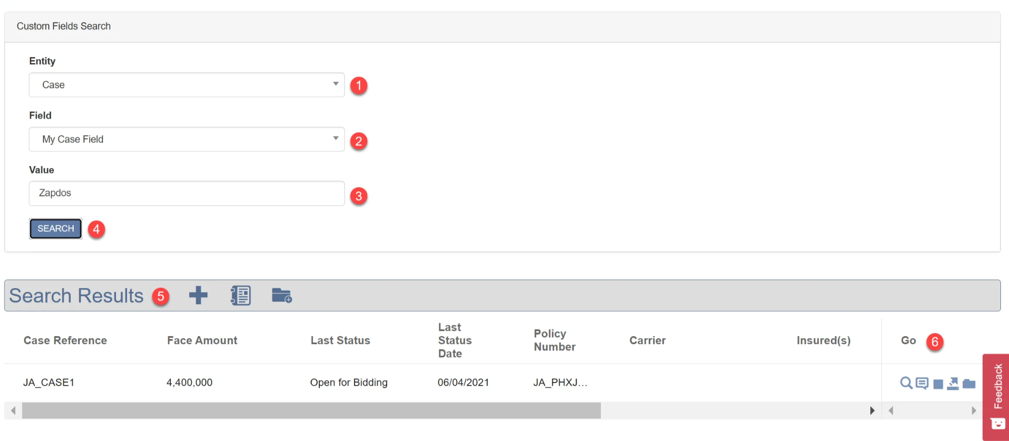 Search Results in the lower pane lists all the (non-snapshot) cases where the chosen custom field value exactly matches the value supplied in the search.