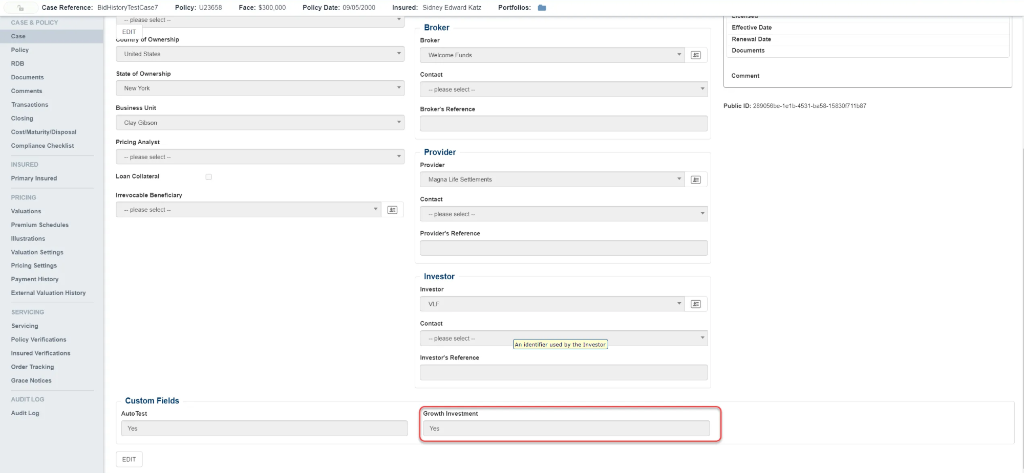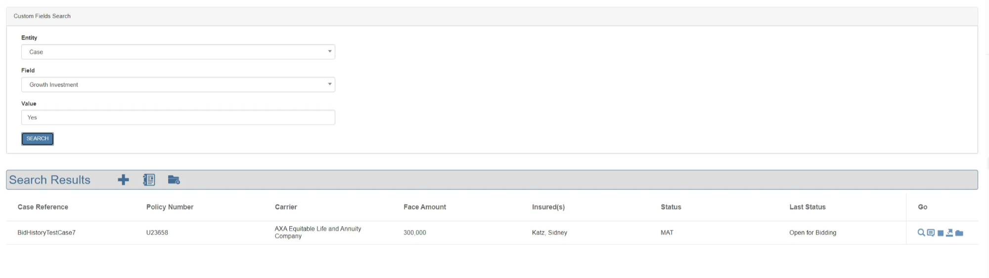 Search Results will display all cases (non-snapshot) where an exact match is found, i.e. where Growth Investment for an Insured is set to Yes.
