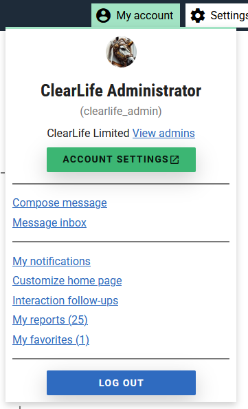 My account is used to give users settings and tools that are specific for the current logged in user. This is where you’ll find your reports, favourites, notifications and more. You can also find a link to change your account settings and security here.