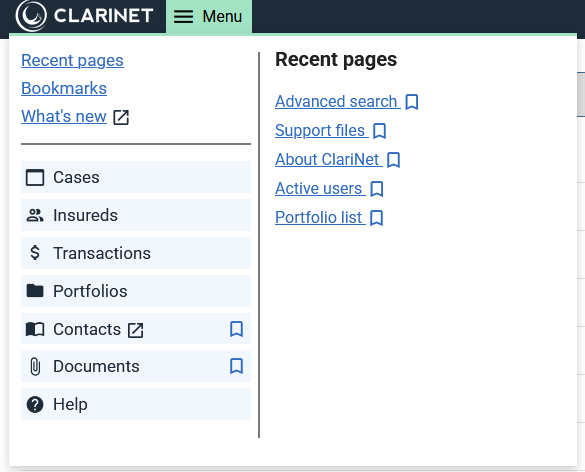 The Main menu is split in to 2 main sections, the left hand being links and your available Modules, while the right shows Recent pages, Bookmarks or changes to show the context of the selected module.