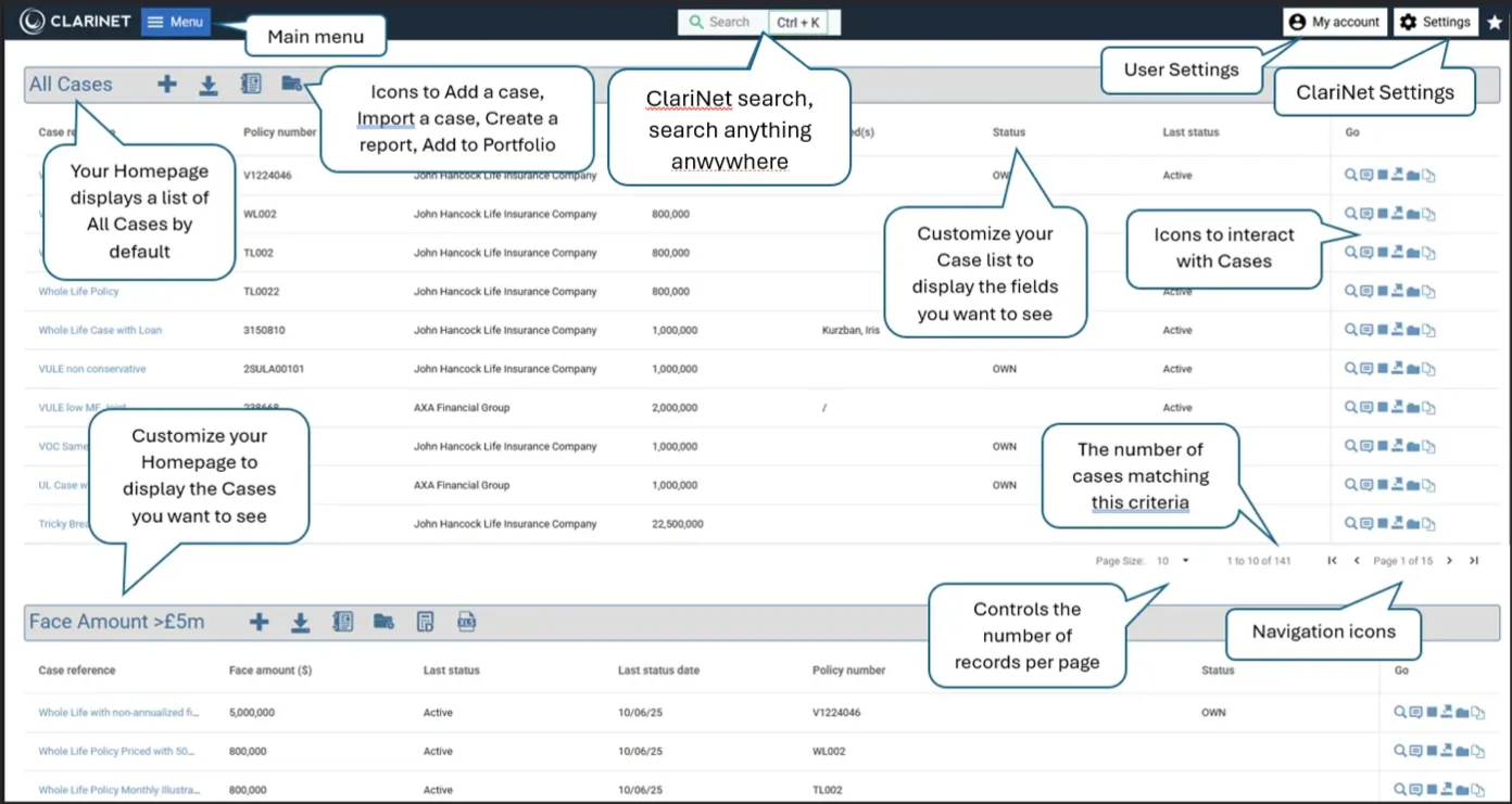 When you successfully log in to ClariNet LS, your Homepage shows a collection of cases with a menu bar and a search facility at the top.