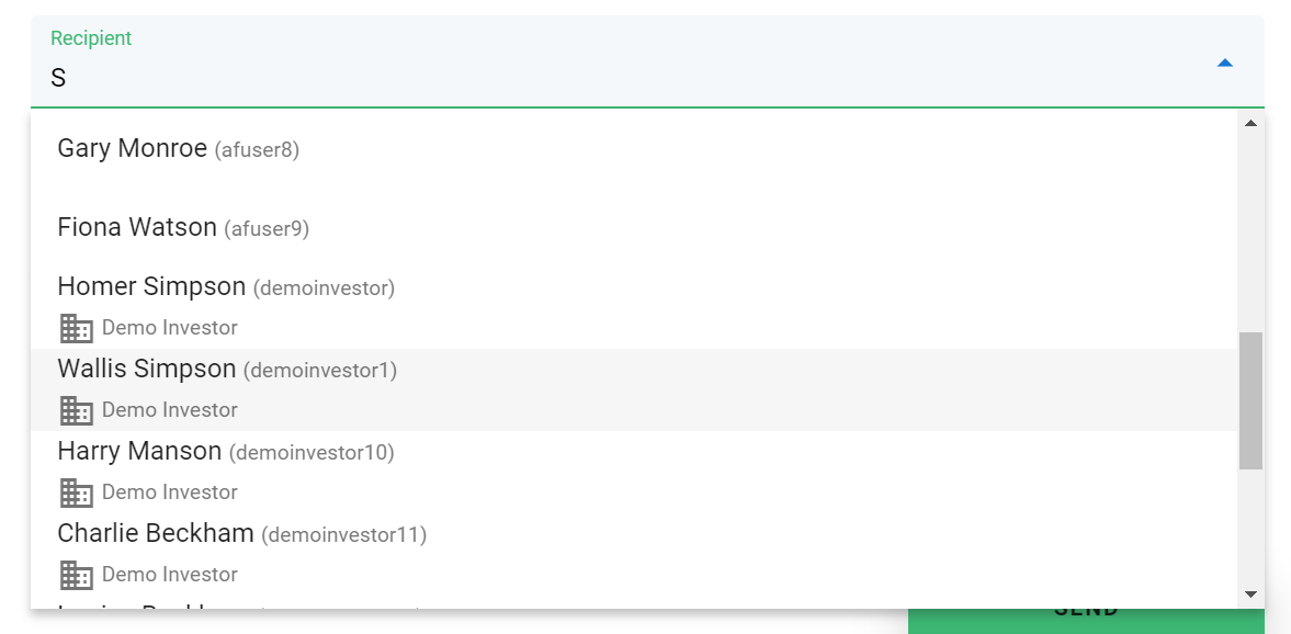 If a user is not in the same company as you, their company name will be displayed under their name in the Recipient dropdown.