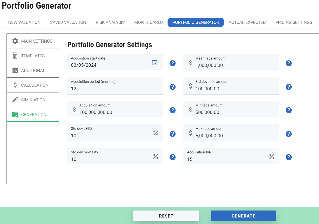 The objective of the Portfolio Generator is to simulate the process of buying a new portfolio and managing it over its lifetime. It first models the acquisition of a “model” Portfolio from an existing Portfolio based on a number of parameters. Monte Carlo Simulation is then used to determine the initial cash balance that would be required to maintain that model Portfolio until maturity (i.e. pay premiums, fees and receive NDB payments) and to project out the performance of the model Portfolio over its lifetime.
