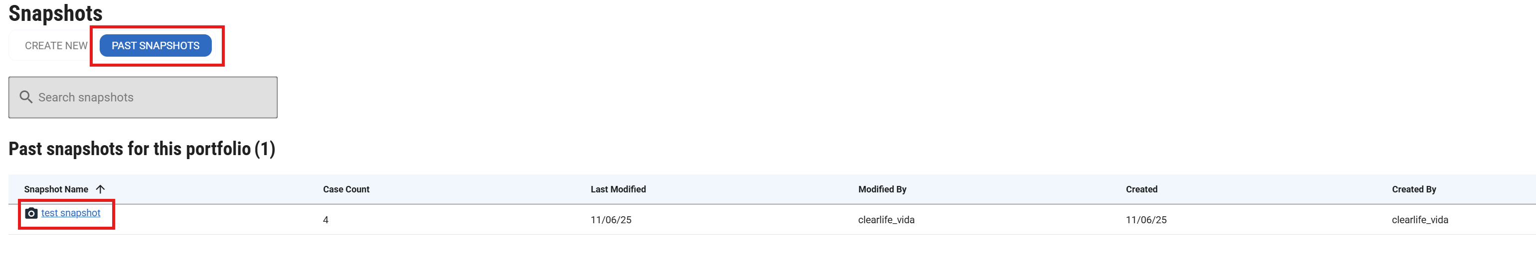 Once created, if you click on the “PAST SNAPSHOTS” tab, you will be able to see the snapshot you just created, and any others for the Portfolio. Accessing that will take you into that Portfolio snapshot, where you will be able to see and browse to the Cases that were snapshot, as they were in the original Portfolio at the time of the snapshot.