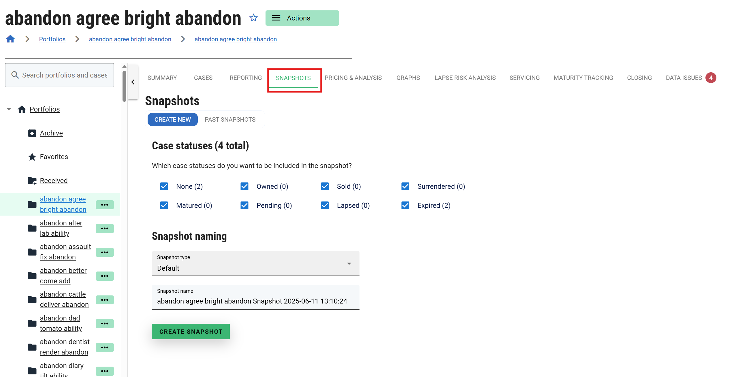 This page presents you with some options that control the Cases that are including in the Portfolio’s snapshot, and the name of the Snapshot. For example, you can limit to active Cases only if you wish.