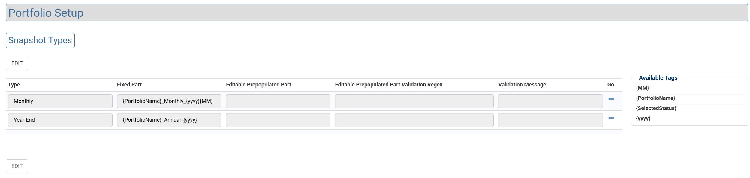 The user is unable to edit this part when creating the Snapshot. The “tags” have been substituted with the appropriate values for the date the snapshot is being taken and the Portfolio that is being snapshot.