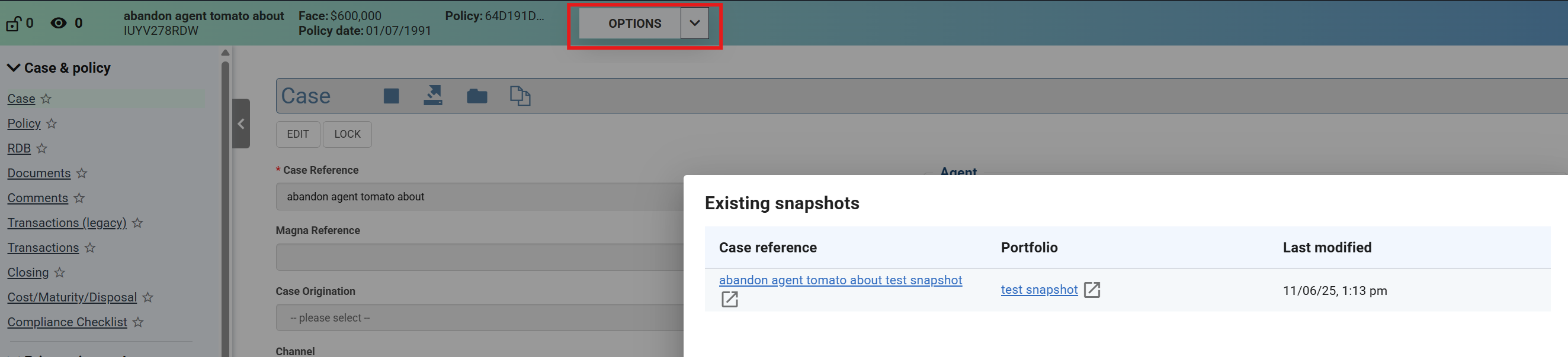 The Portfolio snapshot feature allows you to capture the state of a Portfolio of Cases at a particular moment in time. This can be useful, for example, so that you can regularly capture the state at the end of the month or aligned with significant reporting dates, to allow you to view Policy and other valuation relevant attributes from the Case as they were at a particular point in time.