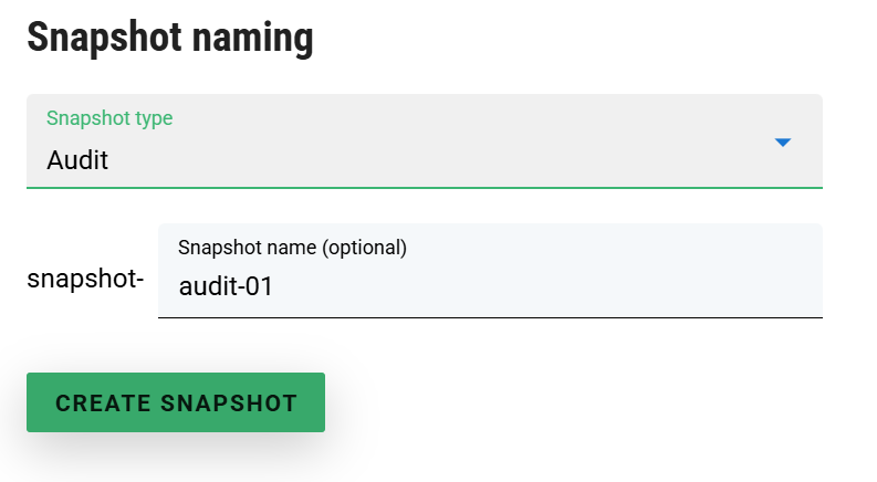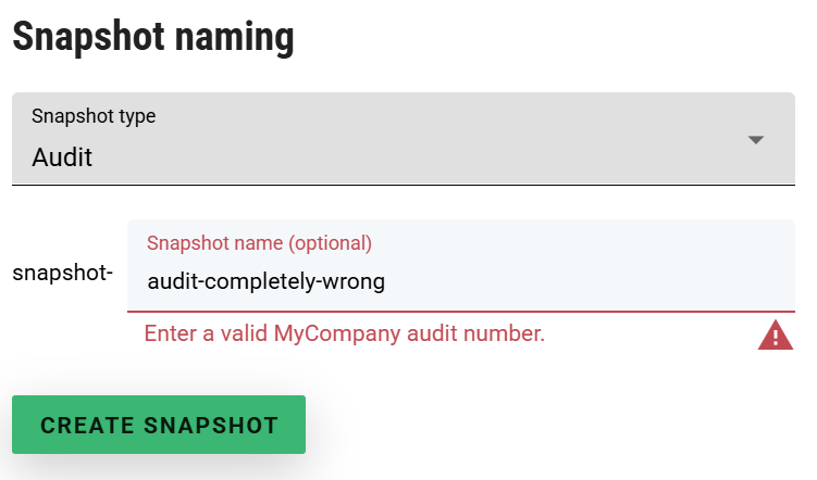 As mentioned earlier, you might need to use the editable prepopulated part in circumstances where you need a particular systematic name for the snapshot, but ClariNet cannot provide a particular value you need. For example, say you wanted to align snapshot names with an internal audit identifier, like snapshot-audit-57. In this case, ClariNet cannot know that the audit number is 57 automatically, so the user has to supply it. However, you want to ensure that users enter something that looks valid. In that case, you can use regular expression validation to increase the chances of that.