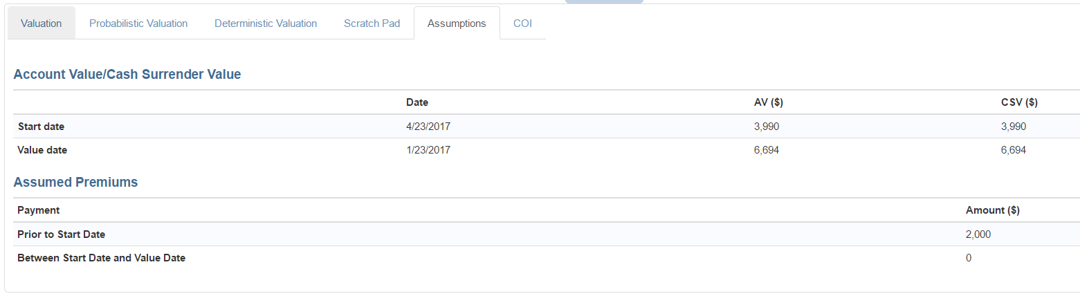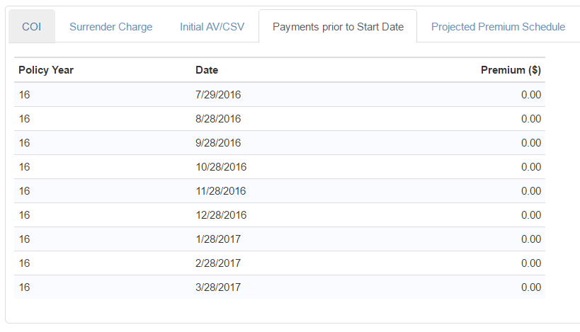 Here, we’ve added a lump sum payment on 28-Feb-2017 of $2,000. This removes the following two premium payments and slightly reduces the following payments. The lump sum payment is noted in the payments prior to Start Date: