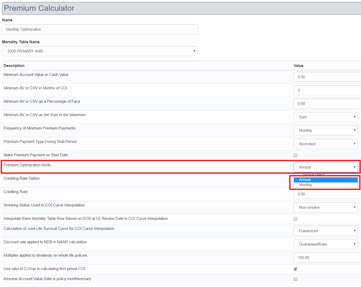 The effect of this parameter is to determine how the Premium Calculator solves for minimum premium payments. The previous behaviour of ClariNet LS was Annual optimization – it targets the threshold AV/CSV at the end of each policy year. If you specify Monthly, it will target the threshold AV/CSV at the end of each policy monthiversary.