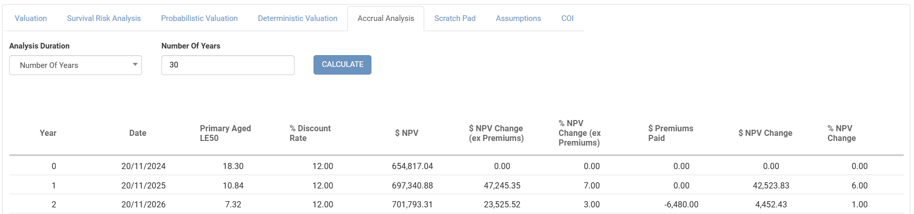 The difference between the first two NPV values is $42,523.88. This reflects the impact of moving the Value Date forward. As the positive expected NDBs are discounted less, they increase in value. However, as the expected premiums are also discounted less, they negatively impact the total NPV.