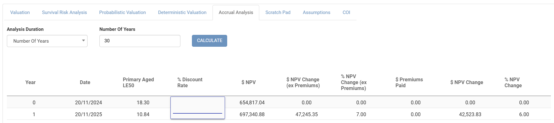 By default the Discount Rate is taken from the NPV IRR in the Valuation Template. Similar to the Aged LE50s, this value can be overridden.