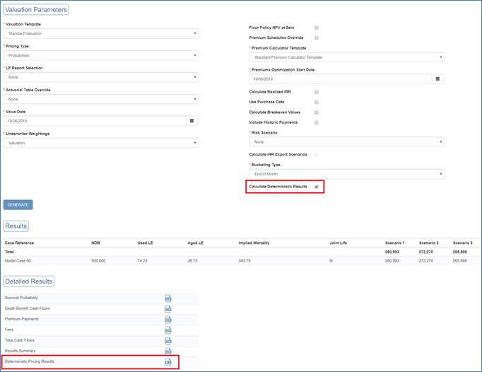 The Portfolio Valuation model includes the option to calculate some deterministic values in addition to the standard probabilistic output. This is selected by checking the box highlighted below. This adds a further option to the downloads under Detailed Results: