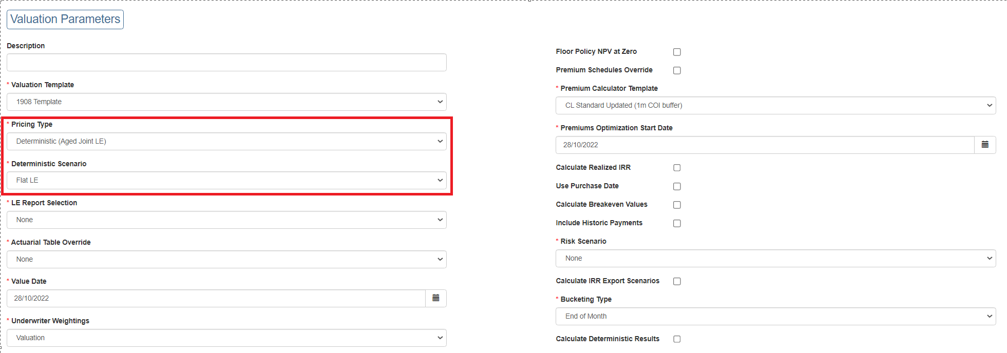 - Deterministic Pricing: a single date of death is determined (either based on user input or a known point in time (e.g. coverage end date, Aged LE50 date). The cashflows are projected to this date to determine the policy value.