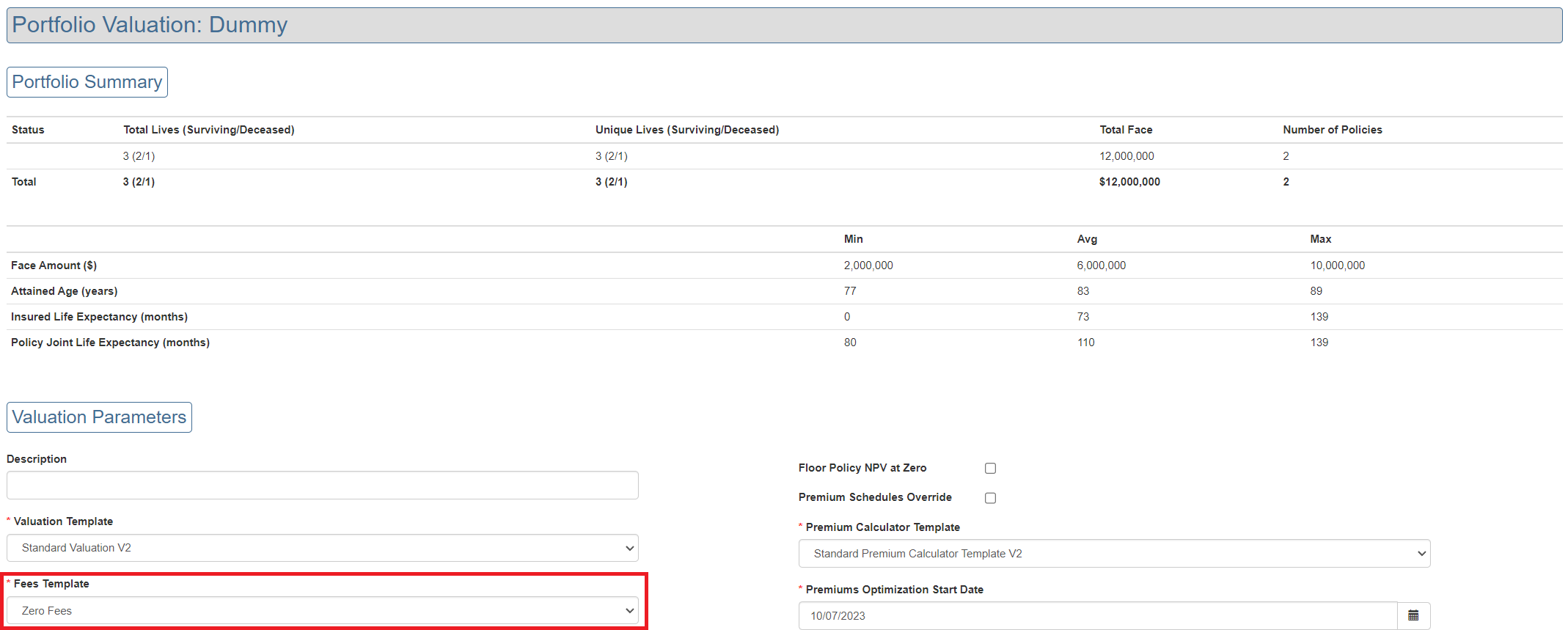 A fixed amount of fees for the entire portfolio can be specified. This is useful where the fee amount is independent of the number of outstanding policies in the portfolio.
