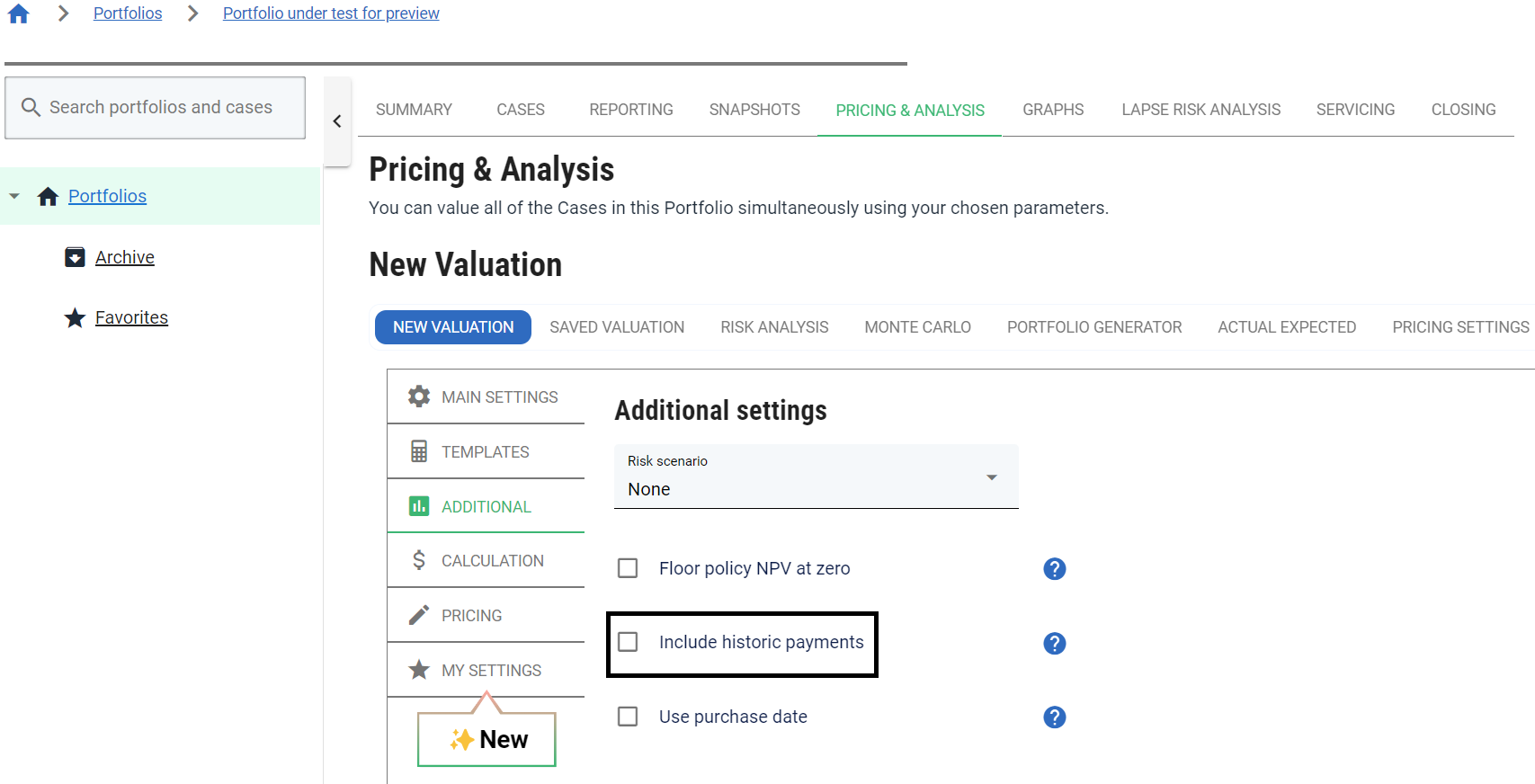 The IRR is calculated such that all past and future cashflows are discounted back to the Purchase Price on Purchase Date. The future cashflows will include expected NDB, Premiums (based on the Used Premium Schedule for the Case) and Fees (based on the Fees Template selected in the Valuation Template). Only cashflows occurring on or after the Purchase Date are included, from both the Used Premium Schedule, the Premium Payment History, and the Fee Payment History tabs in the Case view. Future cashflows are as described under the section Without Historic Payments.