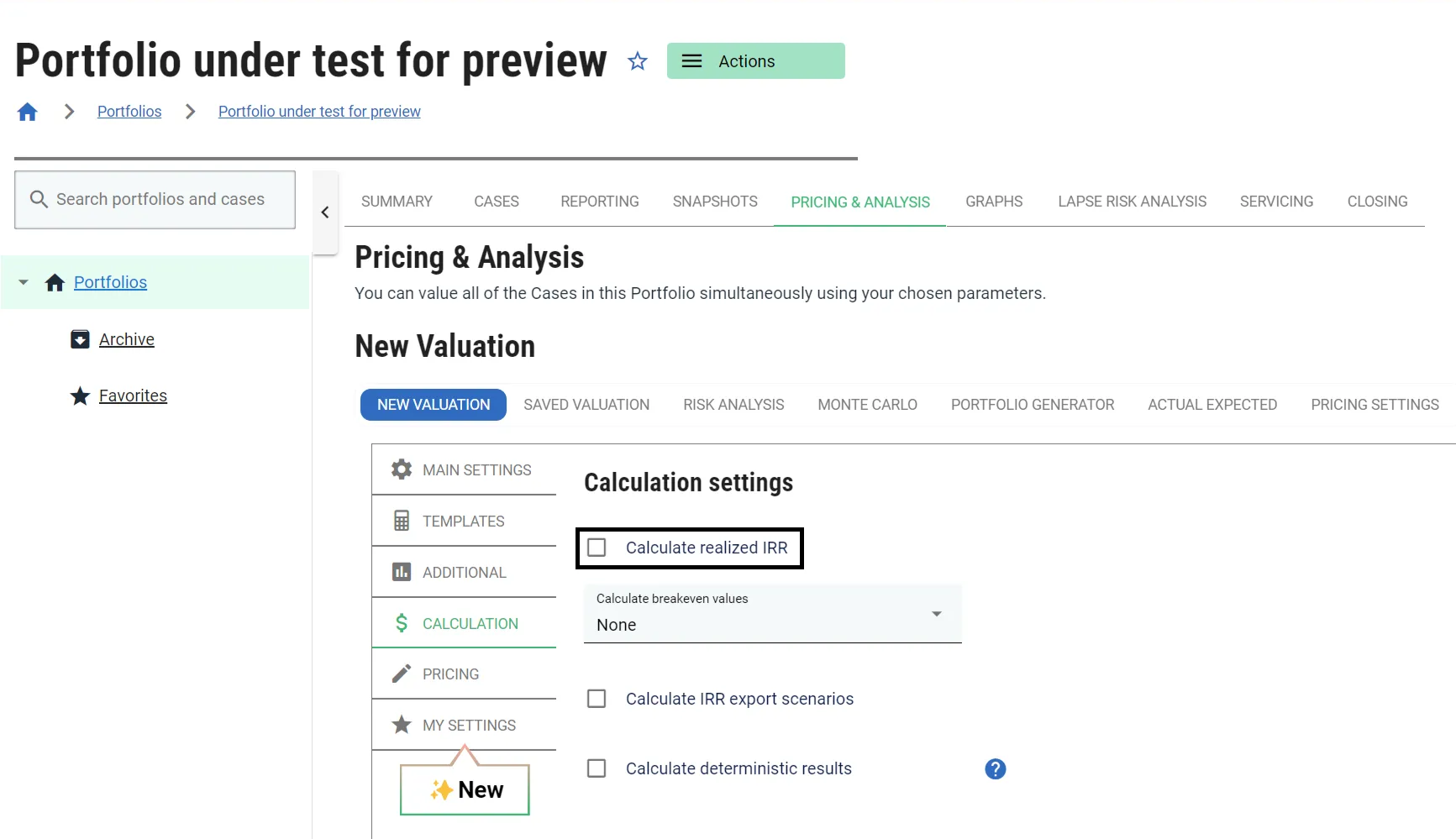 The IRR is calculated such that all future cash flows are discounted back to the Purchase Price on Value Date. The future cashflows will include expected NDB (this expectation can be deterministic or probabilistic, depending on the Pricing Type), Premiums (based on the Used Premium Schedule for the Case), and Fees (based on the Fees Template selected in the Valuation Template).