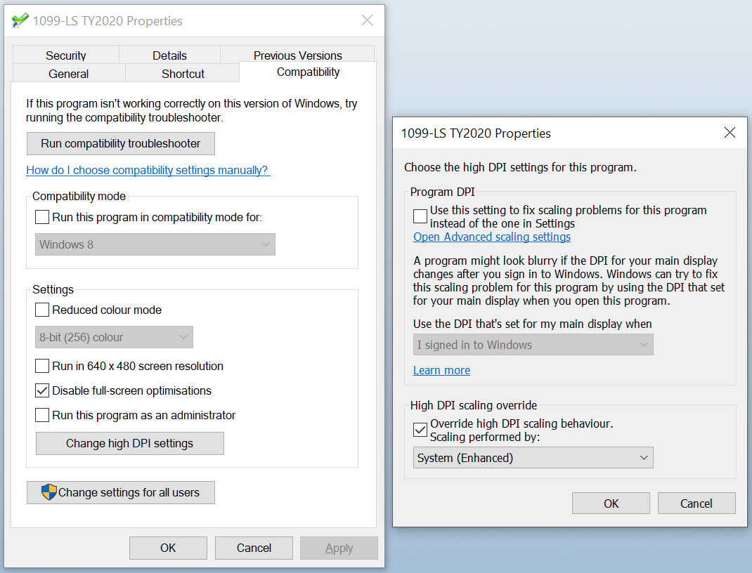 In the 1099FIRE software, if the grey input boxes do not line up with the red lines of the form, check the Properties of the Windows shortcut for the app, on the Compatibility tab, click the Change high DPI setting button, and in the lower part in the High DPI scaling override section check the box Override high DPI scaling behaviour and for Scaling performed by choose System (Enhanced). The relevant screens are shown below.
